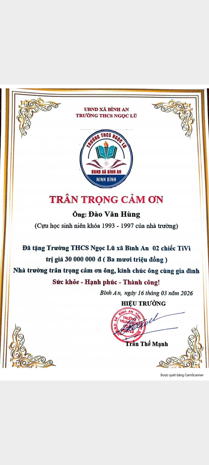 Trong không khí ấm áp của tiết trời mùa xuân, hoà trong niềm phấn khởi của ngày hội cả nước khi thực hiện thành công bầu cửa Quốc hội khoá XVI và hội đồng nhân dân các cấp, sáng ngày 15/3/2026 trường THCS Ngọc Lũ được đón nhận những tình cảm chân thành, những lời tri ân sâu sắc và những phần quà thiết thực của các anh chị cựu học sinh nhà trường khoá 1993-1997. Đặc biệt, anh Đào Văn Hùng – người con của quê hương trống đồng lịch sử, cựu học sinh khoá 1993-1997 đã trao tặng nhà trường 2 chiếc Ti vi trị giá 30.000.000 (Ba mươi triệu đồng). Đây là món quà thực sự có ý nghĩa với các thầy cô giáo, các con học sinh của trường THCS Ngọc Lũ. Trong bối cảnh, nền giáo dục nước nhà đang bước vào sự thay đổi toàn diện, sự chung tay, góp sức của cá nhâ anh Đào Văn Hùng nói riêng và các anh chị cựu học sinh nói chung thực sự rất có ý nghĩa. Cũng tại buổi trao tặng này, khi biết cơ sở vật chất phục vụ cho dạy và học của nhà trường vẫn chưa đáp ứng được, anh Đào Văn Hùng và các bạn có nhã ý sẽ vận động và trao tặng cho nhà trường đủ Ti Vi trang bị trên các lớp học còn thiếu. Thay mặt nhà trường, thầy Trần Thế Mạnh – Bí thư chi bộ, hiệu trưởng nhà trường gửi lởi cảm ơn chân thành tới cá nhân anh Đào Văn Hùng và những người bạn đã dành cho thầy và trò trường THCS Ngọc Lũ những tình cảm trân quý và hứa sẽ bảo bảo, sử dụng phần quà tài trợ của cá nhân anh Đào Văn Hùng và những người bạn một cách hiệu quả nhất. Qua đây, nhà trường cũng mong muốn tiếp tục nhận được sự tài trợ về CSVC của các mạnh thường quân, của các cựu học sinh để các em học sinh trường THCS Ngọc Lũ có điều kiện tốt nhất để lĩnh hội tri thức, hình thành nên phẩm chất, nhân cách con người Việt Nam trong thời đại mới./.